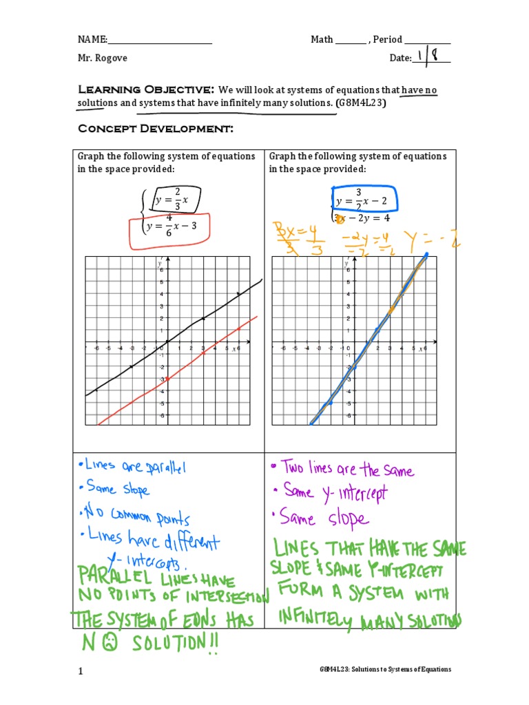 Does the following system of non-homogenous equations have a solution. Study Guide and Intervention Solving Systems of Equations Algebraically Substitution To solve a system of linear equations by substitution first solve for one variable in terms of the other in one of the equations. Texas Go Math Grade 8 Answer Key available here aids students teachers and parents to get a good hold of the concepts in a better way. 6-1 Study Guide and Intervention Graphing Systems of Equations Possible Number of Solutions Two or more linear equations involving the same variables form a system of equations. Systems of Linear Equations Systems of Linear Equations A system of linear equations is when two or more linear equations are involved in the same problem. Solve by Adding or Subtracting. A system of equations of parallel lines will have no solutions. These materials include worksheets extensions and assessment options. Covers the following skills.